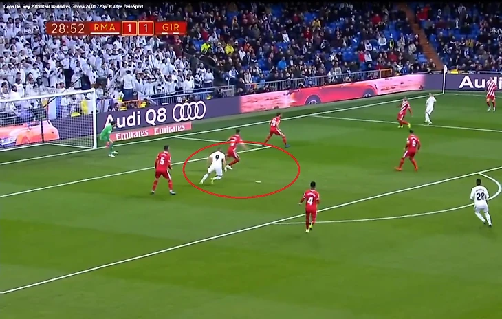 Здесь можно выделить 2 момента. Во-первых, Винисиус не всегда принимает правильные и своевременные решения, о чем уже неоднократно писалось. А, во-вторых, Бензема в окружении 4 защитников нашел свободное пространство и был угрозой для вратаря Жироны.