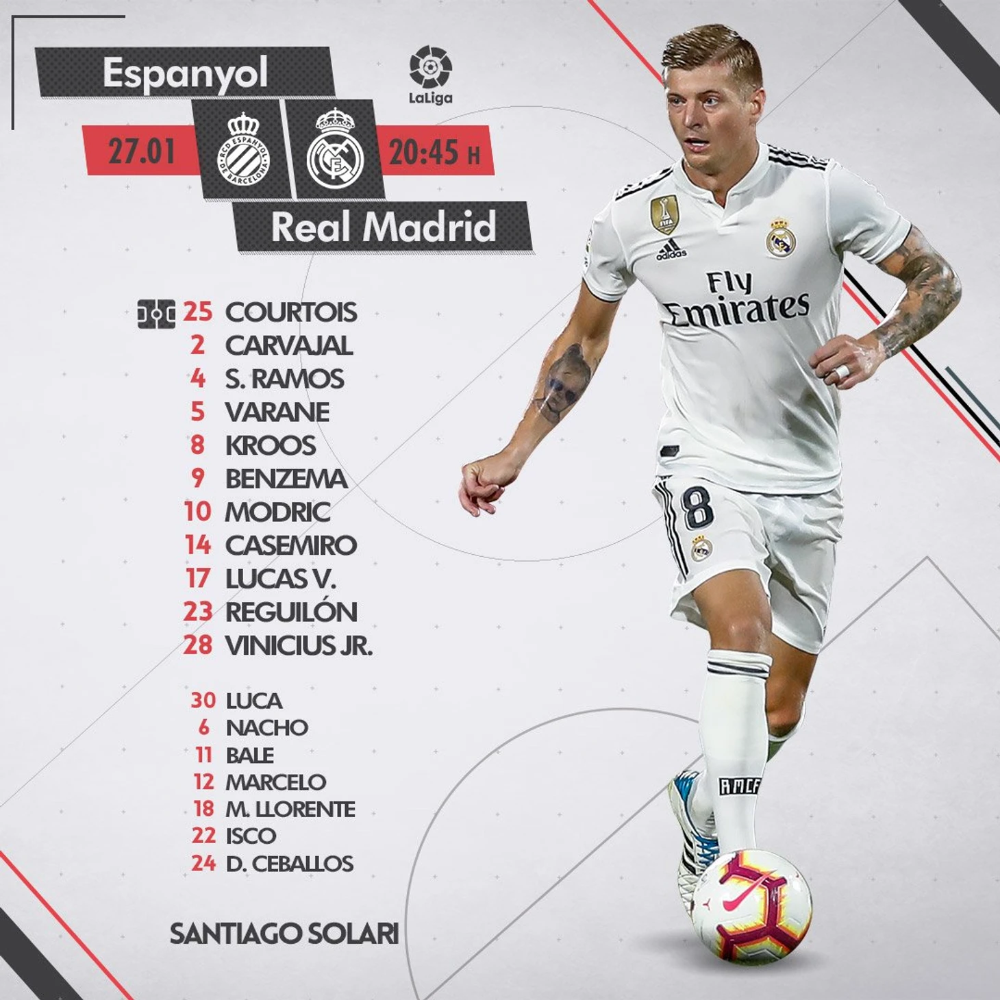 С учетом того, что Регилон стал выбором номер 1 для Солари, а Кроос полностью восстановился от травмы и сыграл с Жироной в кубке, никаких неожиданностей в выборе стартового состава не было.