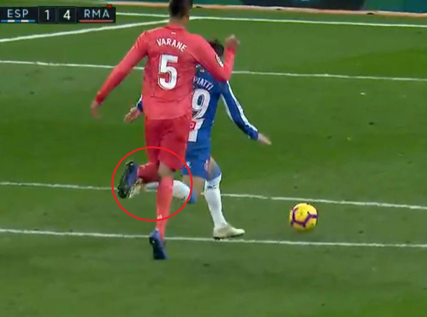 Варан бежал справа от нападающего и догонял его. Затем он решил сзади сместиться левее, чтобы обойти форварда слева. Делая свой маневр, игрок Эспаньола пяткой задевает Варана. Итог: игрок теряет равновесие и падает.