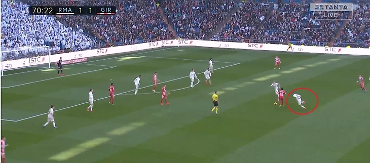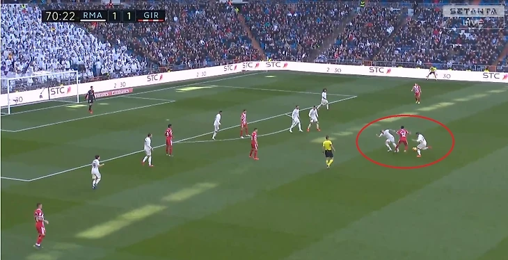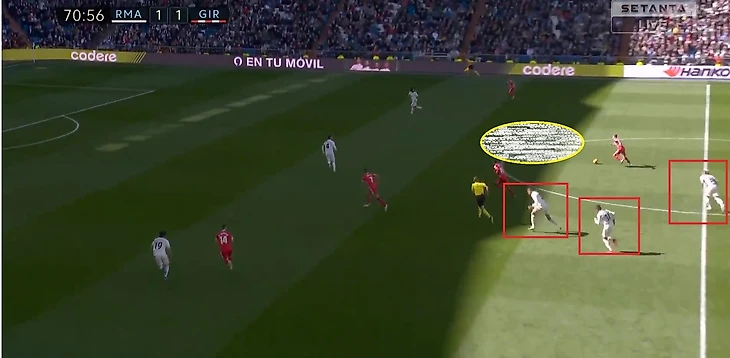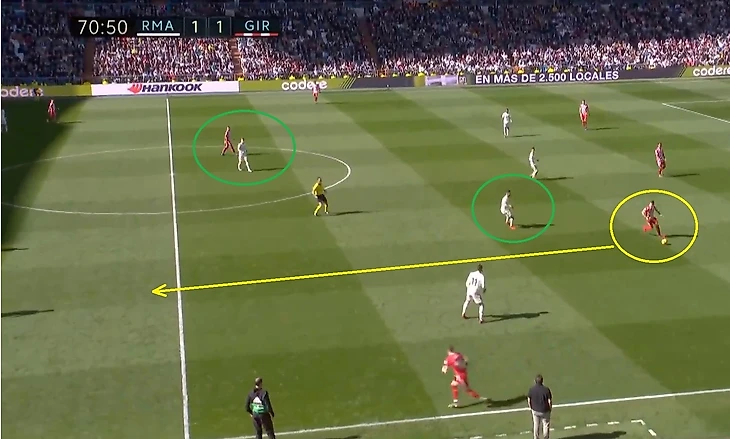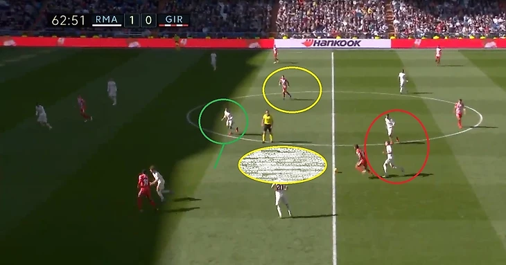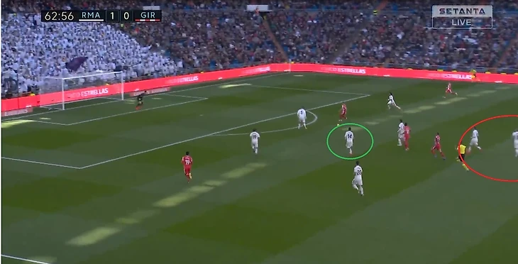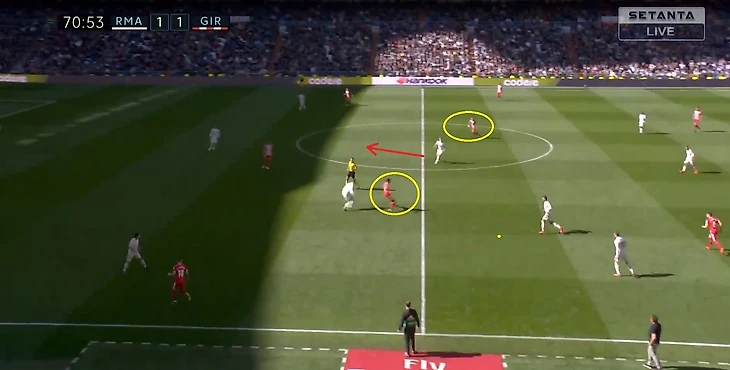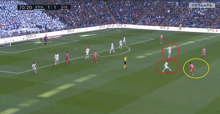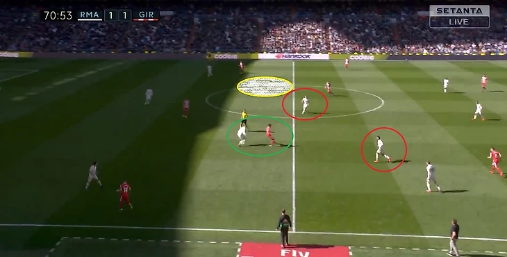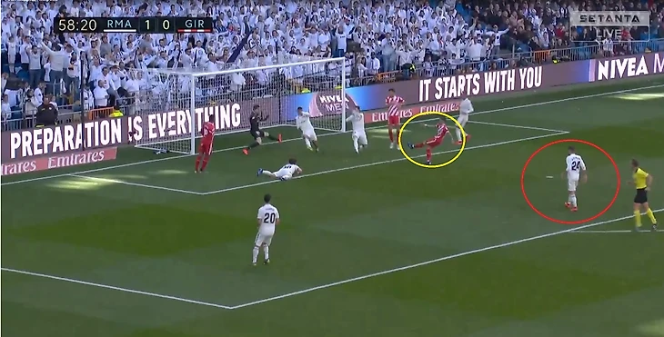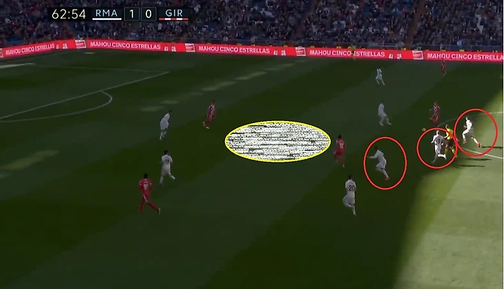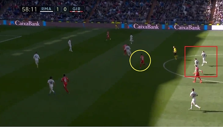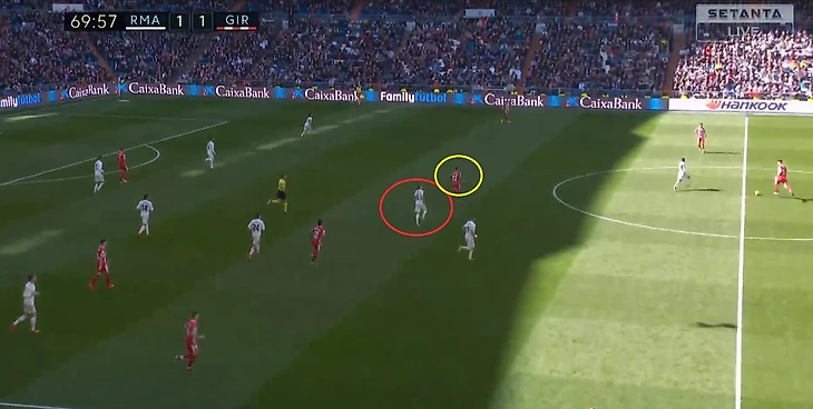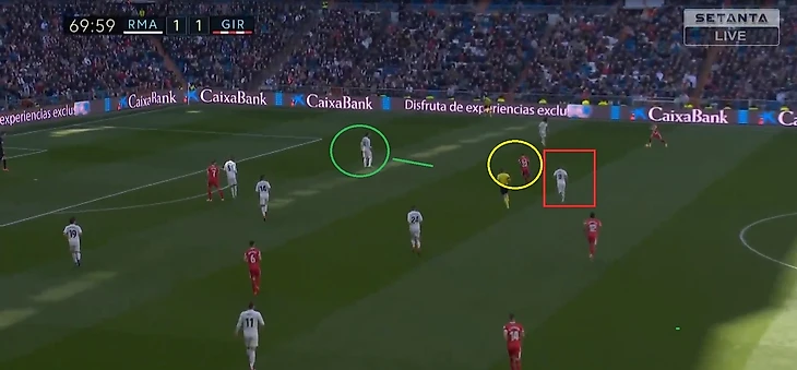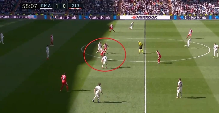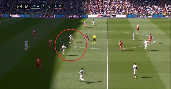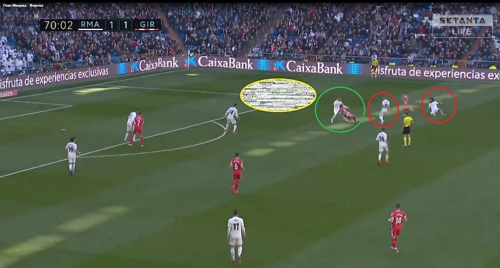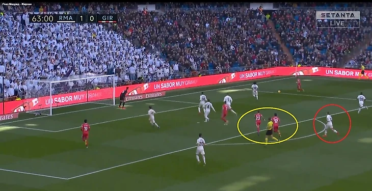 Кроос забывает про своего игрока и пытается предугадать действия игрока Жироны, оставляя за своей спиной громадную зону, куда и пойдет пас.