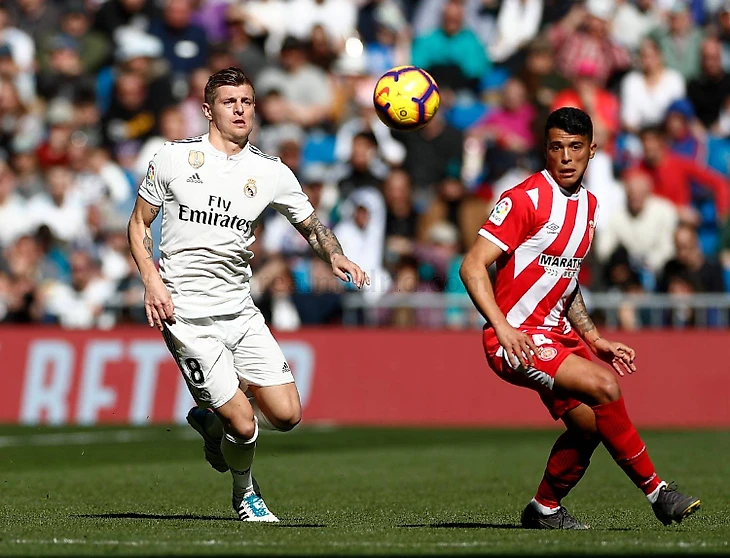 Мяч у защитников Жироны. Кроос снова упускает игрока, которого должен держать.