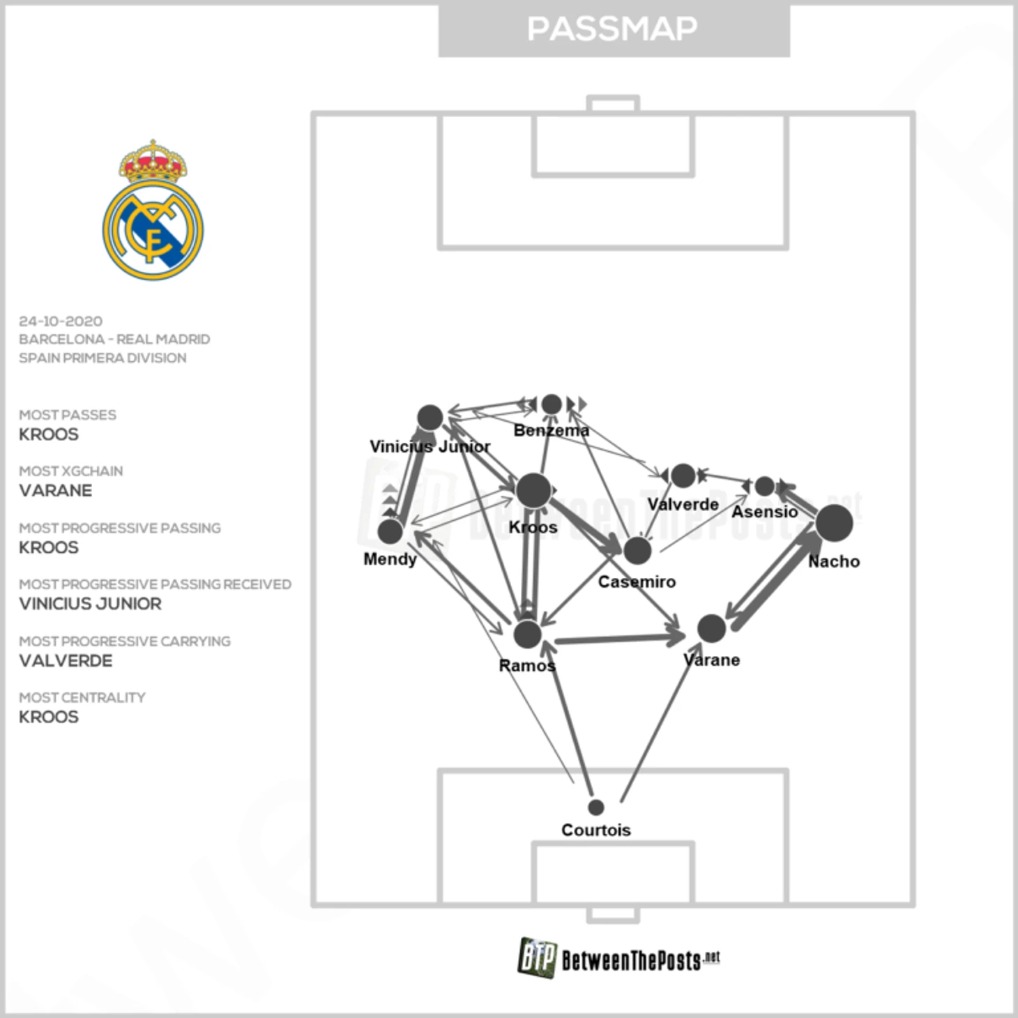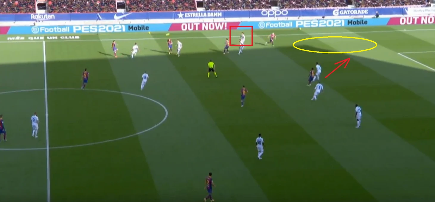 В этом моменте Крооса зажали сразу два игрока, он отпасовал на Серхио и тот сразу перевел на одинокого Начо. Идеальный пас который разбил прессинг Барселоны.