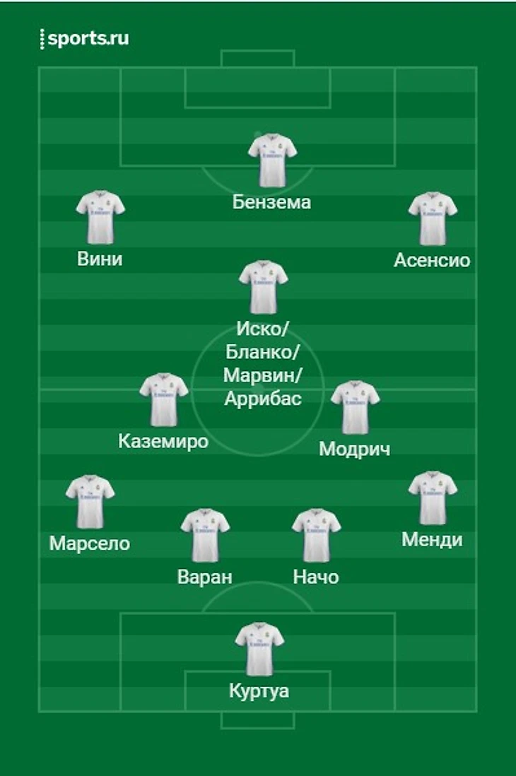 Вопрос только по Иско, готов ли он выйти в старте. Если нет, то скорее всего выйдет Марвин или Аррибас, так как они уже имели опыт игры в основной команде. Если же выйдет Бланко (вариант который хотел бы увидеть я), то он будет играть ниже, а Модрич чуть выше.