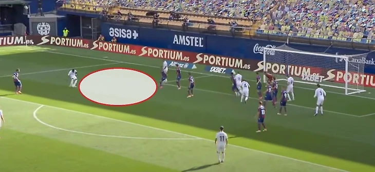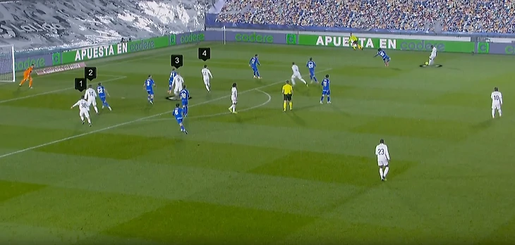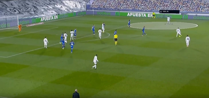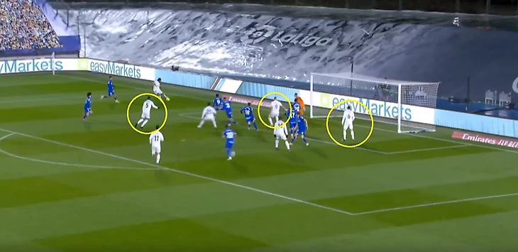 Здесь то же самое. Марсело простреливает, а у него целых 5 предложений. Аррибас и Менди (который забил) на ближней, а Бензема, Асенсио и Винисиус в центре штрафной. Защитников также меньше, чем нападающих.