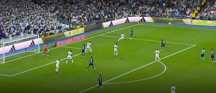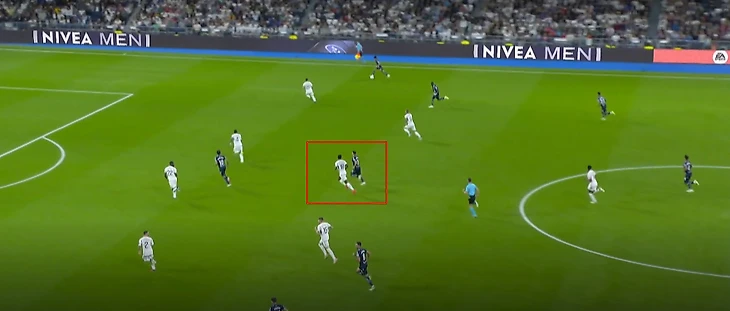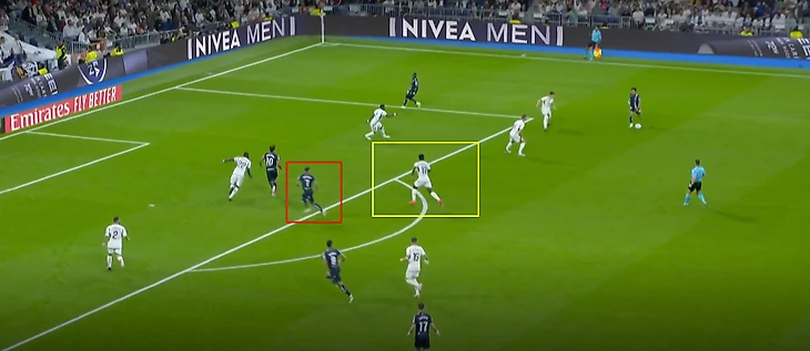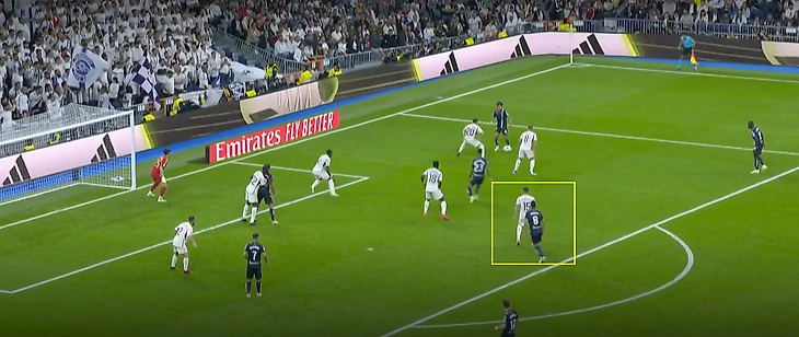 Мерино отклеивается от Рюдигера. Тчуамени и сам Рдигер на это не реагируют, они строго держут зоны. Это видит Феде и бежит перекрывать пас испанца. А Кубо все еще с мячом.