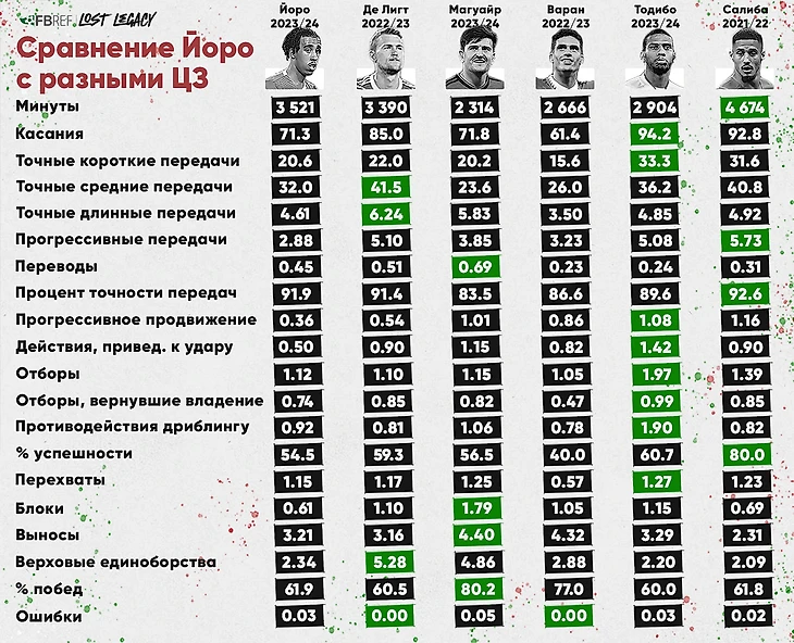 В 18 лет Йоро – середняк среди лучших сезонов: Маттейса Де Лигта в «Баварии», Харри Магуайра в современном стиле, Рафаэля Варана в «Юнайтед», Жан-Клера Тодибо в «Ницце» и Вильяма Салиба во Франции.