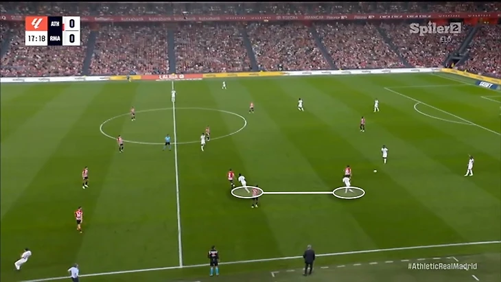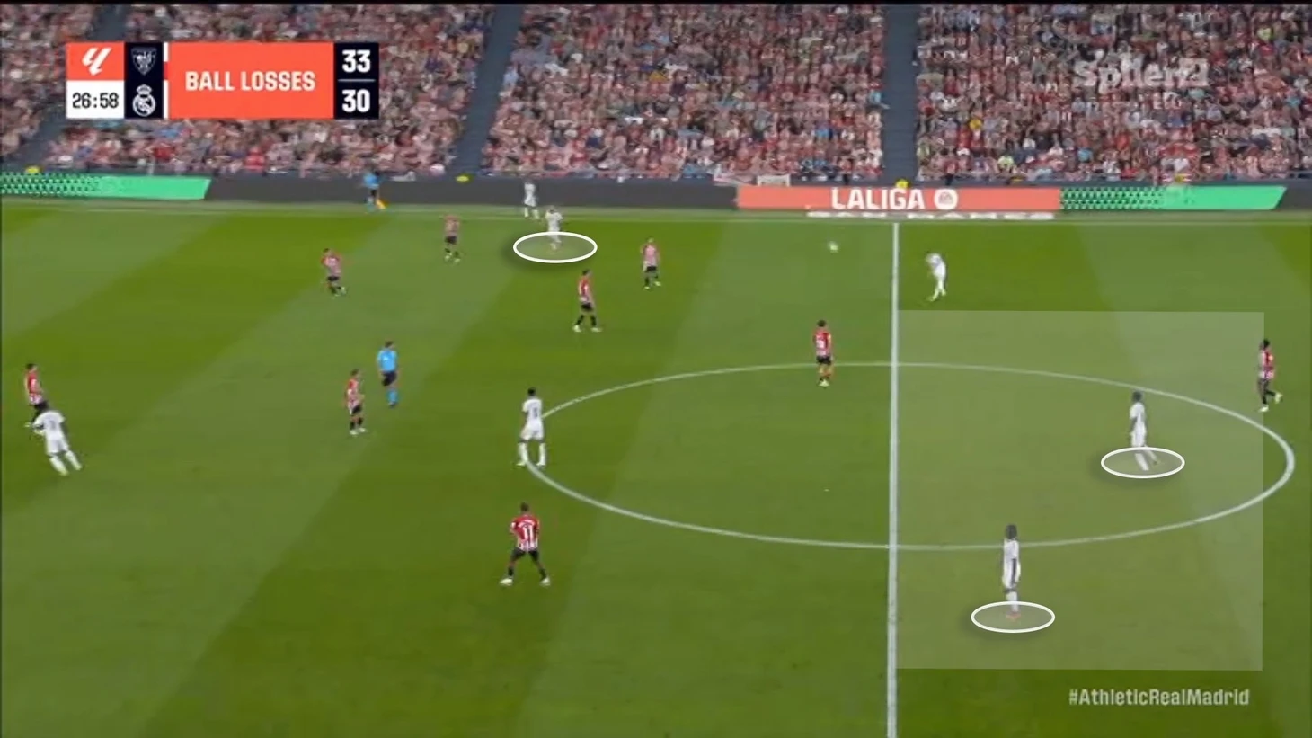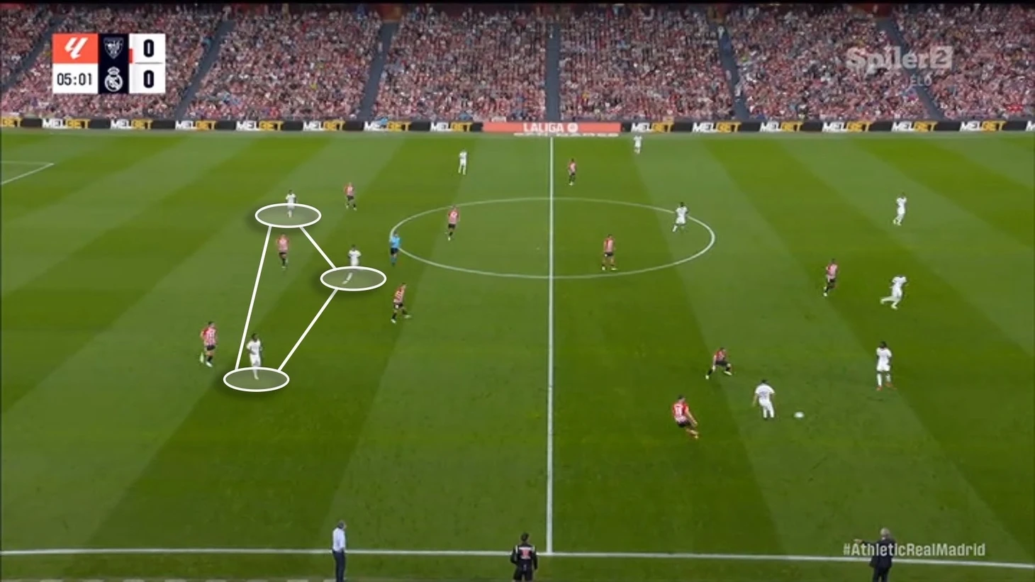 После коротких розыгрышей у своих ворот, игроки пытались выйти в атаку или через длинный заброс вперед (в основном, этим занимались Алаба, Фран и Камавинга), или через движение Родриго/Беллингема, которые двигались очень хаотично и постоянно заставляли реагировать игроков «Бильбао» на свои перемещения, но что не менее важно — прекрасно контролировали мяч в узких коридорах, не теряя его.