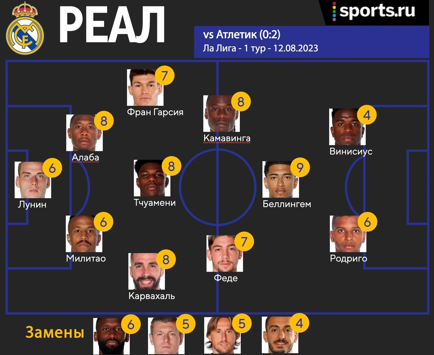 Эдер Милитао — 6. Эдер проводил очень хороший матч и оценка наверняка была бы выше, если бы не травма и вынужденный уход с поля. К моменту выхода текста степень тяжести травмы еще неизвестна, но Карло сказал, что «все выглядит плохо». Потеря Милитао может стать очень ощутимым ударом для команды — у «Мадрида» нет защитника со схожим набором качеств, способного выдавать такой объем работы.
