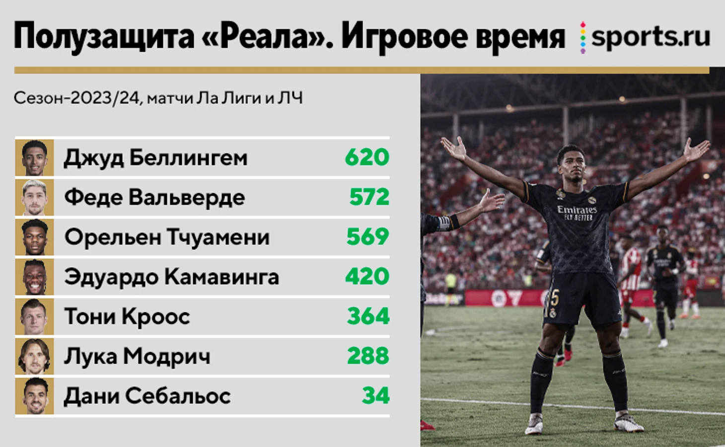 У Крооса 5-е время среди полузащитников на старте сезона, у Модрича — шестое. Разрывы не очень большие (Тони отыграл лишь на 56 минуты меньше идущего четвертым Камавинги), но важен контекст: немец вышел в основе только в 3 матчах.