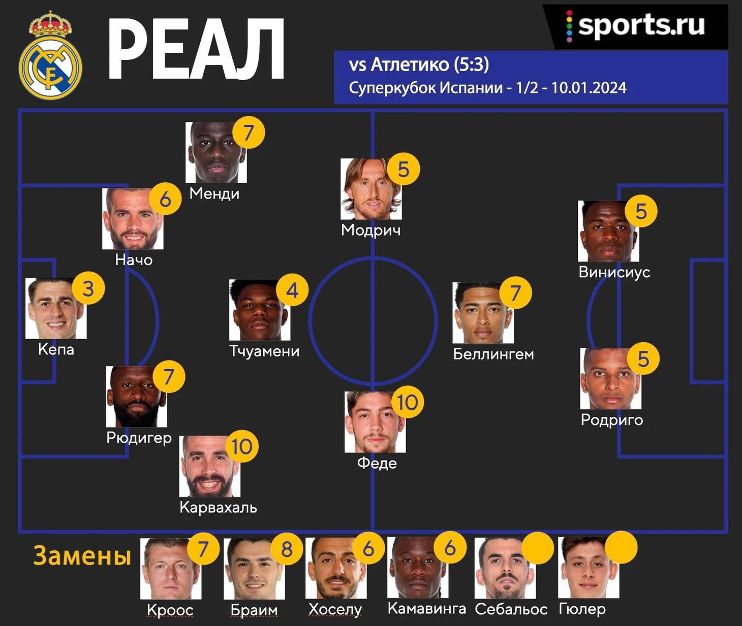 Винисиус, Родриго — 5. Бразильцы провели грандиозный матч с точки зрения работы без мяча (очень мощная работа в прессинге), но не смогли отличиться результативными действиями. В таких играх от них ждешь именно этого. Провалом такую игру точно не назвать, но Вини и Родриго не сияли и не делали разницу. Тем не менее, нельзя не отметить, что именно благодаря их действиям родился гол Карвахаля, потому что никто бы не смог убежать в том эпизоде от Хименеса так, как это сделал Винисиус. Он все еще набирает форму (всего лишь 2 игра после травмы), ждем выхода на лучший уровень к началу февраля. Родриго мог забить гол-шедевр, но Облак выручил. Ожидаем от бразильцев более мощного выступления в финале, желательно с голами/голевыми передачами.
