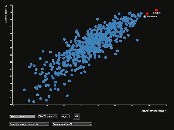 С Тчуамени все еще проще: он уже сейчас уступает в продвижении мяча вперед в рамках топ-7 лиг только Тони Кроосу.