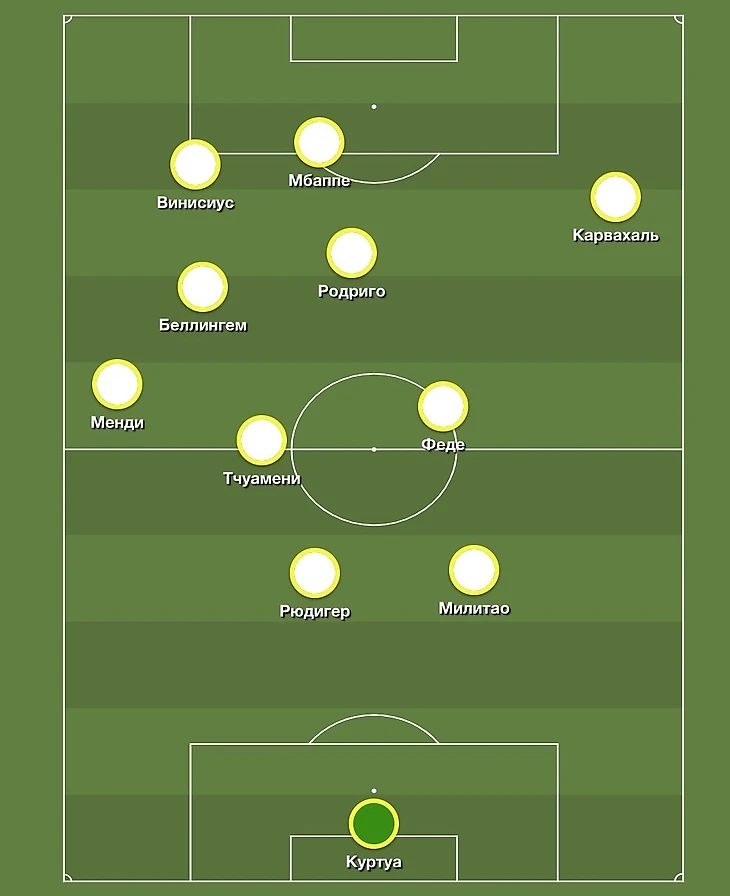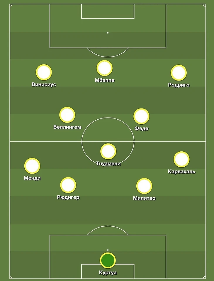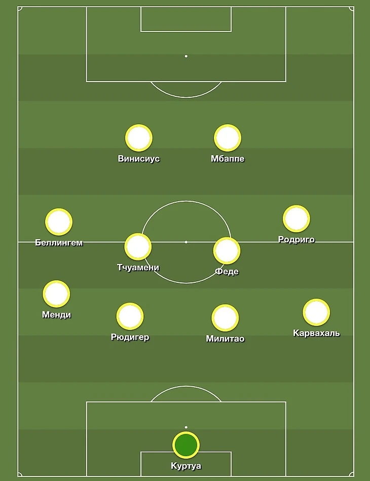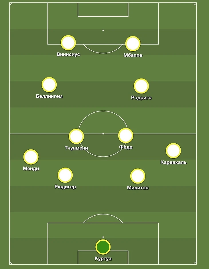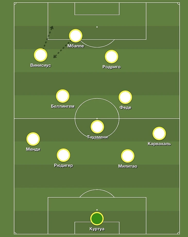 При обороне «Мадрид» будет выстраиваться в классические 4-4-2, где фланги будут закрывать Беллингем и Родриго, а Мбаппе и Винисиус будут оставаться в высокой позиции.