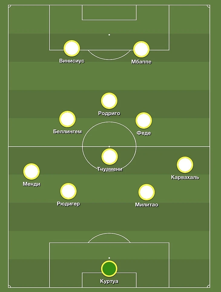А играть в 4-4-2 с ним и Тчуамени в основе – это дисбаланс в сторону обороны. Не забывайте, что слева у «Реала» стартует Менди. Если добавить к этому еще и двух чистых опорных полузащитников (оба француза игроки оборонительного плана), то сдерживать атаку «Реала» станет гораздо легче – Беллингему опять придется разрываться на несколько позиций, а Винисиус и Мбаппе будут получать меньше возможностей.