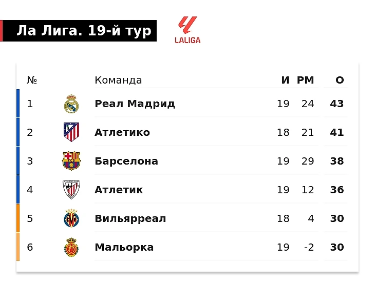 «Мадрид» вышел на первое место в чемпионате, но теперь нет матча в запасе. У «Атлетико» одна игра в минусе, команда Диего Симеоне проведет ее, «Реал» и «Барселона» уедут на Суперкубок Испании.