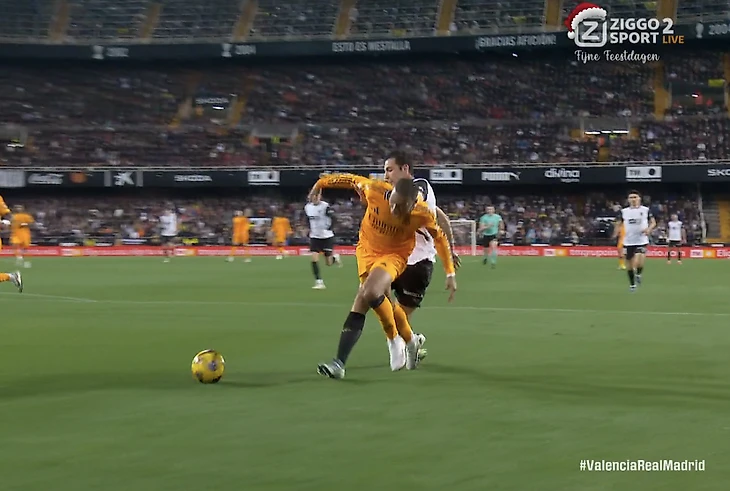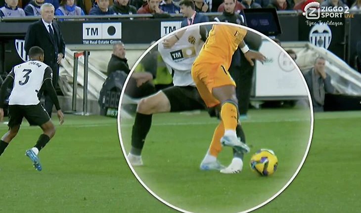 И снова вопросы к Сото Градо: защитник «Валенсии» в штрафной до удара, а ноги вратаря Столе Димитриевски не на линии. Но в Джуд попал в штангу, из-за этого судьи в Ла Лиге часто игнорируют пересмотр пенальти. Похоже, такой же случай.