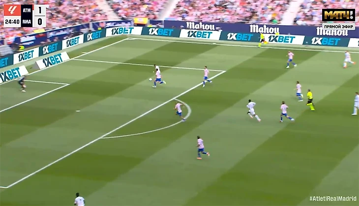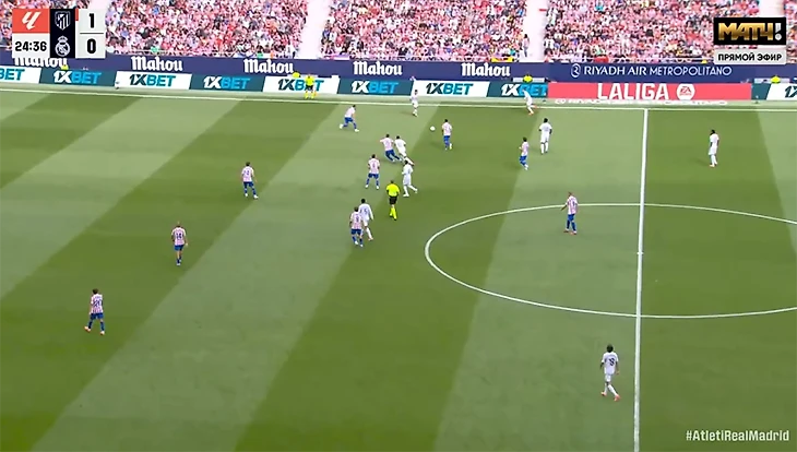 Развалился правый фланг обороны. Проблемы начались еще до старта игры: Хаби выпустил в основе Джуда, посадил Франко Мастантуоно и поменял позицию Арды Гюлера. В итоге Гюлер, в отличие от Франко в прошлых матчах, не успевал помогать Дани Карвахалю, поэтому Дани постоянно покидал линию и играл выше обычного. По цепочке позицию терял и Эдер Милитао, вынужденный страховать уже самого Карвахаля – и «Атлетико» очень легко вскрывал фланг забросами в освободившееся пространство, регулярно вбегал Александр Серлот.