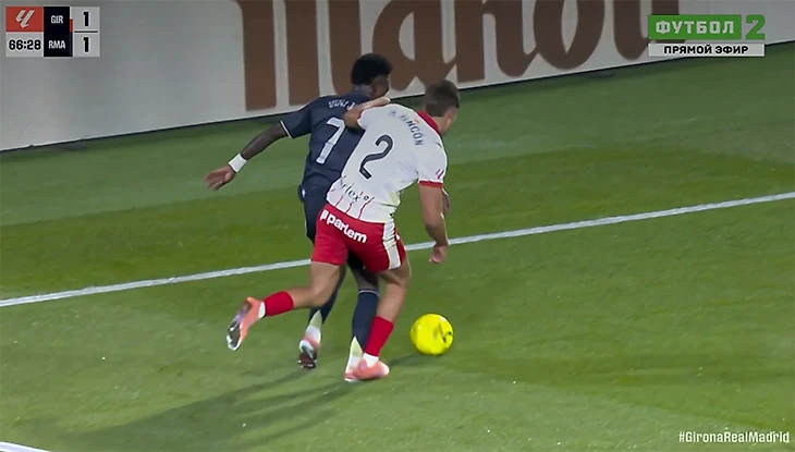 «Мадрид» начал активнее, но почти не создавал моментов – один яркий сэйв совершил вратарь Пауло Гассанига. «Жирона» играла на контратаках. «Реал» впервые взломал защиту на 40-й минуте: очередной гол Килиана Мбаппе отменили – из-за игры рукой во время атаки. Хотя судья Рикардо Бенгоэчеа сначала засчитал гол. ВАР все исправил.