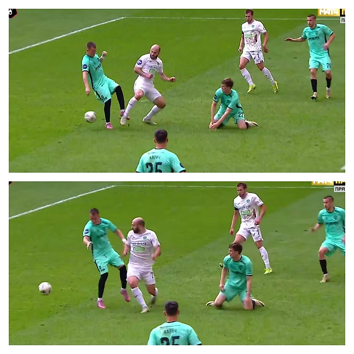 Вишенкой на торте в этом матче смотрятся назначения ВАР арбитров. Андрей Фисенко и Роман Сафьян, пара помогавшая Казарцеву в матче Спартак - Динамо Махачкала, запомнившемуся рядом своеобразных решений, но тогда весь вагон хейта принял на себя непосредственно главный судья. Далее Фисенко работал ВАР арбитром на недавнем дерби Динамо - Спартак, там тоже не обошлось без скандала, после чего тренер Спартака Станкович был дисквалифицирован на месяц за брань в адрес арбитров. А в девятом туре Фисенко, находясь у мониторов в матче Пари НН - Ахмат, позвал к ним главного арбитра Чистякова, разглядев вот это нарушение.