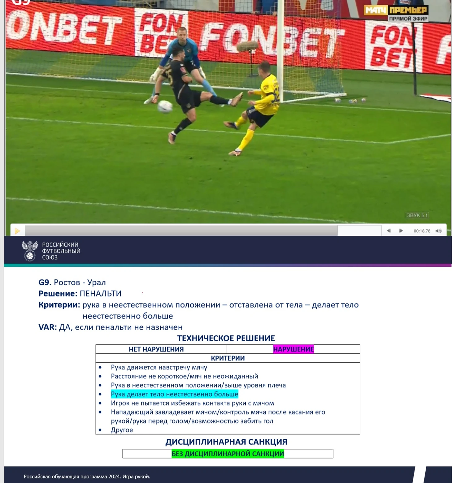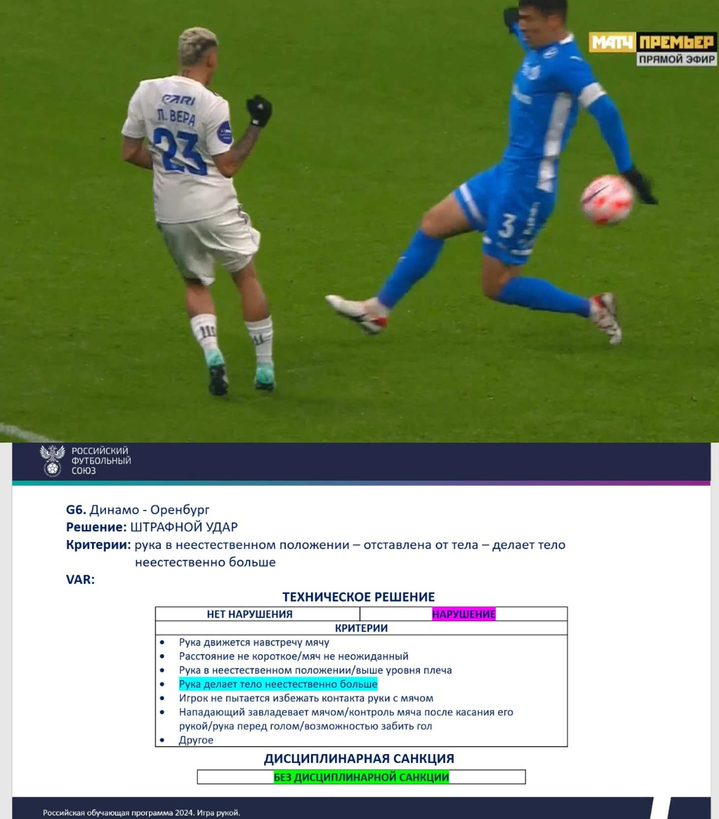 Как видим: то что в эпизоде с Круговым названо «естественным положением руки» в этих эпизодах таковым не является и вердикт однозначен - нарушение правил. Конечно, кто - то начнёт спорить об устаревших трактовках, и тогда нам стоит заглянуть в методичку за нынешний год . Где представлен вот такой эпизод.