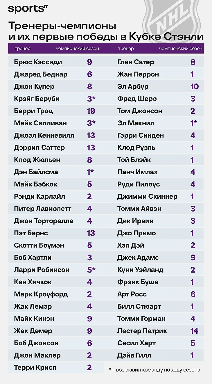 В этой таблице – все тренеры-чемпионы с 1927 года. Понятно, что совсем ранние не показательны, потому что там тренерская профессия как таковая только зарождалась – и победить мог примерно кто угодно. Скажем, Билл Стюарт выиграл с «Чикаго» в 1938-м в дебютном сезоне, а через полгода был уволен и вернулся судить бейсбол. А Куни Уэйланд ушел из «Бостона» сразу после победы в 1941-м и в НХЛ уже не работал. Такие времена.