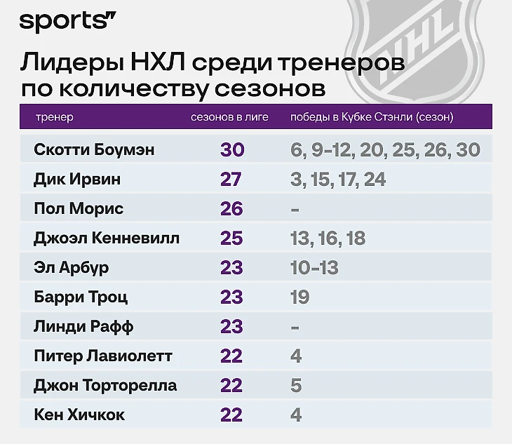 Он уже третий по количеству сезонов как тренер, а по матчам вообще второй – впереди только Скотти Боумэн, до которого около 300, надо продержаться еще четыре сезона. Сейчас ему 57 – и после двух финалов Кубка Стэнли как будто все реально. А уж если получится победить – вообще без вопросов.