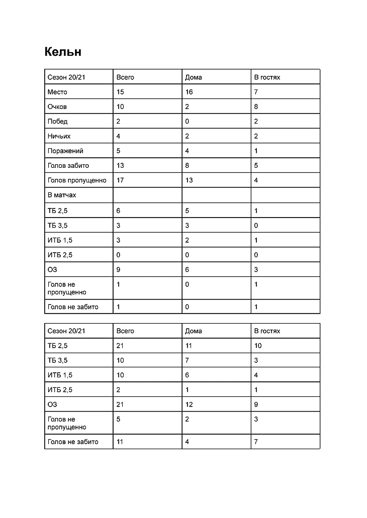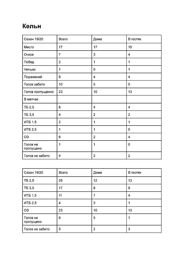 Кельн лучше прошел на выезде. 21 раз играл ТБ 2,5 и ОЗ да Кельн 9 раз сыграл в ничью ТБ 3,5 играл только 10 раз