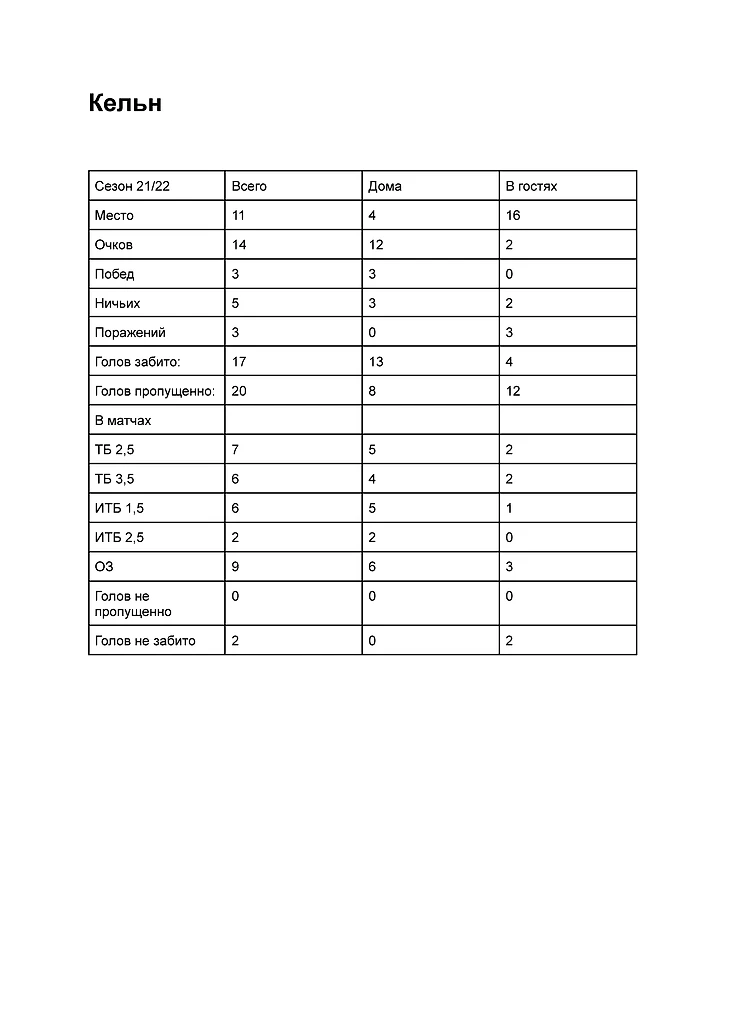 Итог: Кельн будет реже играть в ничью Должен до рождества победить на выезде и проиграть дома ОЗ да будет играть, но показатель этот будет стабилен. Прогноз: место от 9 до 15.