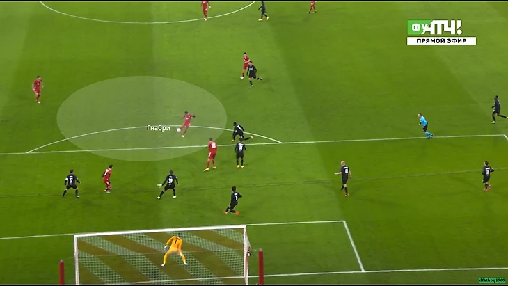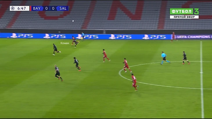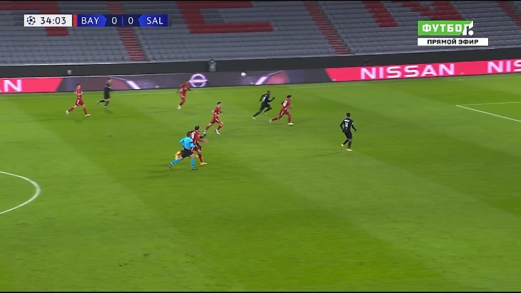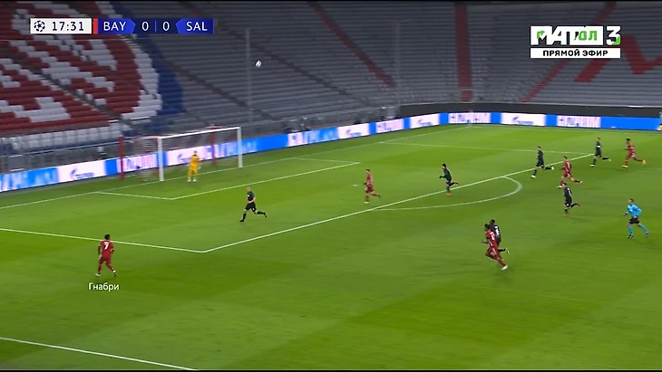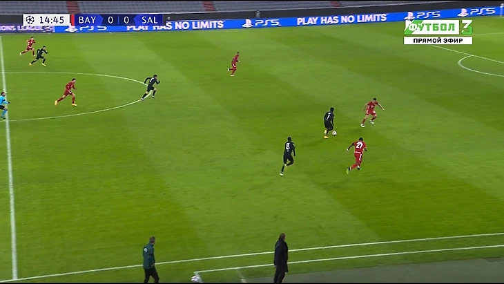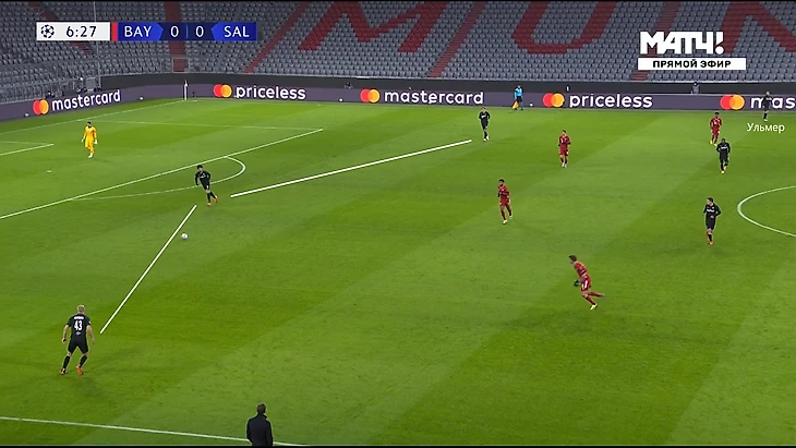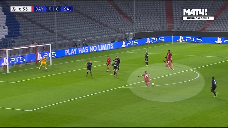 5. Несмотря на то, что Зальцбург успешно оборонялся, у них все равно были проблемы. Одной из них была зона подбора. Дважды там никого не оказалось и это чуть не привело к голу. В 1-м случае Мюллер пробил в Рамальо, во 2-м Гнабри ударил немного выше ворот.
