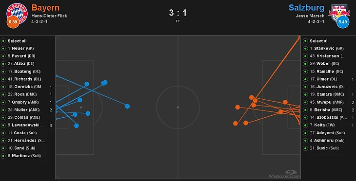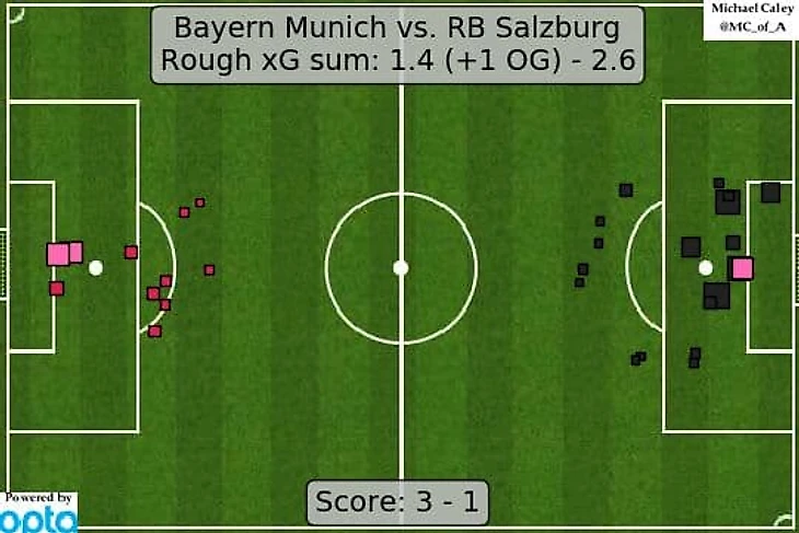 8.Если обратиться к статистическим показателям, то можно увидеть, что Бавария очень сильно проиграла по ожидаемым голам, что вообще не свойственно для команды Флика. А также по версии "Opta" у Зальцбурга было 6 явных голевых моментов, в то время, как у Баварии всего 2.