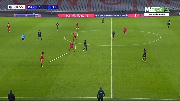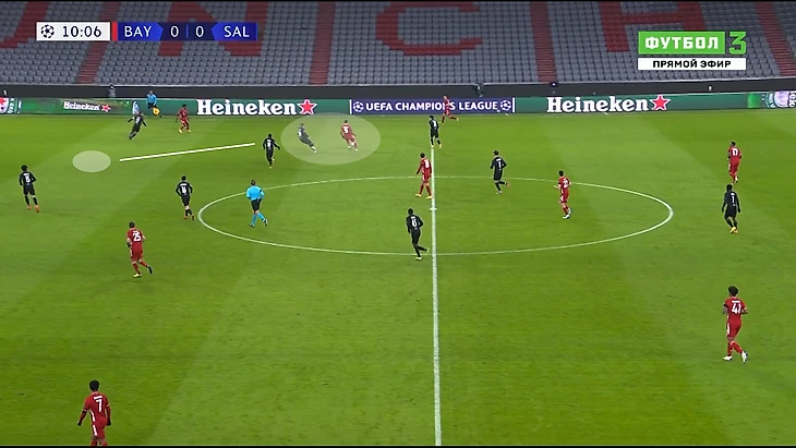 Мюнхенцы также нашли ещё один способ атаковать, что для них конечно не является новинкой - забросы вперёд на быстрые открывая вингеров. Они провоцировали высокое давление Зальцбурга и растягивали их компактную схему по вертикали вверх, тем самым освобождая зоны для вингеров.