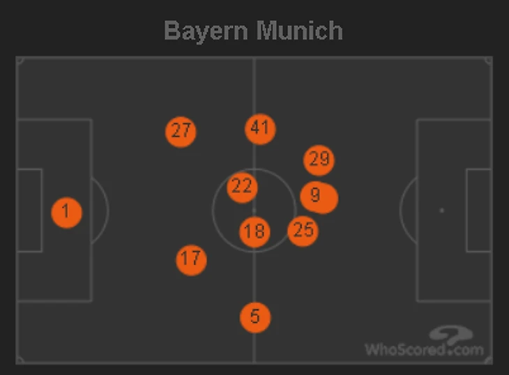 3. Билд-апп Баварии был построен на том, что один из крайних защитников ( чаще это был Ричардс, на фото с усреднёнными позициями можно прекрасно это увидеть ) поднимался выше в полуфланг, тем сам создавая небольшой перегруз на фланге и сковывая действия флангового полузащитника Зальцбурга. Рока или Горецка опускались ниже к центральным защитникам, чтобы создать численное преимущество в начале атаке – но зачастую это было бессмысленно, т.к весь центр был под контролем австрийцев.