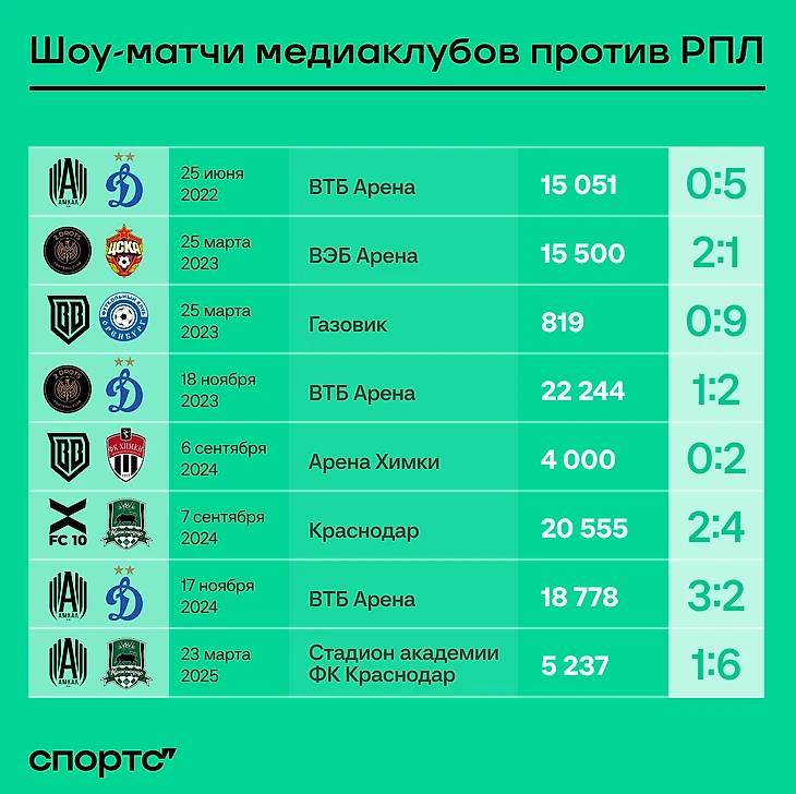 В 2024-м МКС не состоялся – букмекеры не отпустили клубы играть в турнире с другим спонсором (BetBoom). Но «Динамо» не остановилось: в ноябре 2024-го сыграло с «Амкалом» (2:3), победителем Кубка Медиалиги. На «ВТБ Арене» собралось 18 тысяч, за «Динамо» сыграли фигуристка Евгения Медведева и актер Павел Деревянко. После игры Деревянко кайфовал: «В мои 48 с половиной лет немного тяжеловато. Я говорю ребятам: «Меняйте меня!» Мне никто не сказал, что нужно было мяч выбить, ха-ха. Я мяч не пинал лет 15. Восторг дикий!»