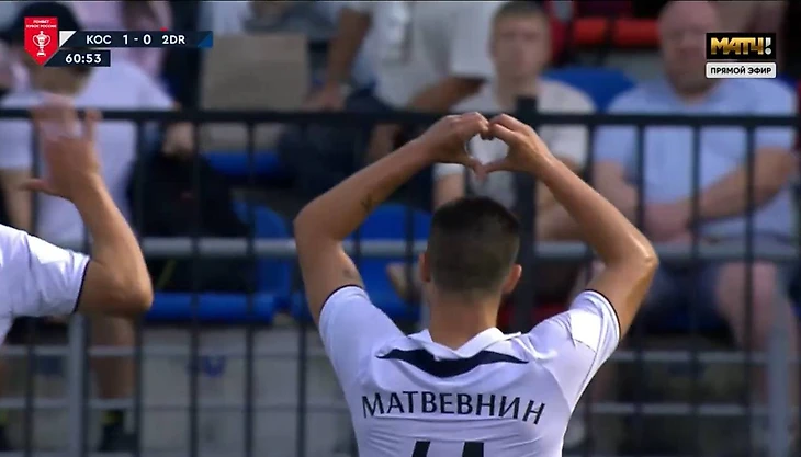Хавбек Данила Матвевнин реализовал удар с точки и подбежал к трибуне «самураев» – показал сердечко и фамилию на спине.