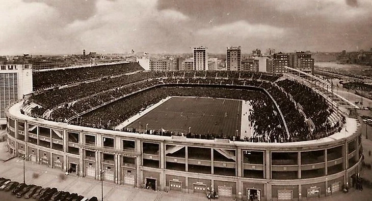 В середине 1940-х годов вместимости старого стадиона «Чамартин» «Реалу» стало не хватать. 22 июня 1944 года банк выделил кредит Сантьяго Бернабеу и Рафаэлю Сальгадо на покупку земли возле старого стадиона. 5 сентября 1944 года прошла выставка макетов и проектов нового стадиона. К работе подключились архитекторы Мануэль Монастерио и Луис Солер. Уже 27 октября этого же года начались строительные работы.