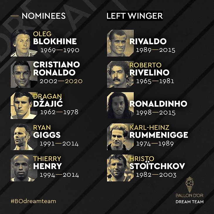 Левые вингеры/нападающие: Олег Блохин, Ривалдо, Криштиану Роналду, Роберто Ривелино, Драган Джаич, Роналдиньо, Райан Гиггз, Карл-Хайнц Румменигге, Тьерри Анри, Христо Стоичков.