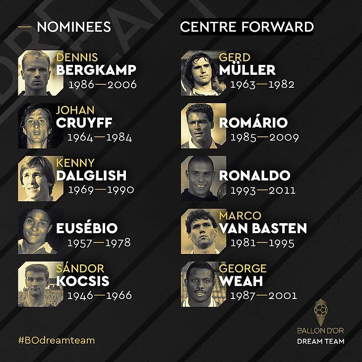 Центрфорварды: Деннис Бергкамп, Герд Мюллер, Йохан Кройфф, Ромарио, Кенни Далглиш, Роналдо, Эусебио, Марко ван Бастен, Шандор Кочиш, Джордж Веа.