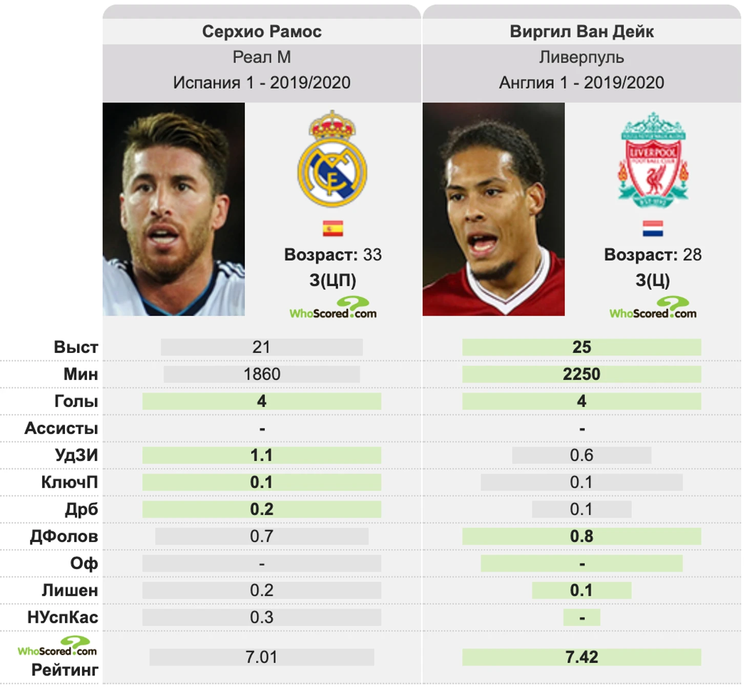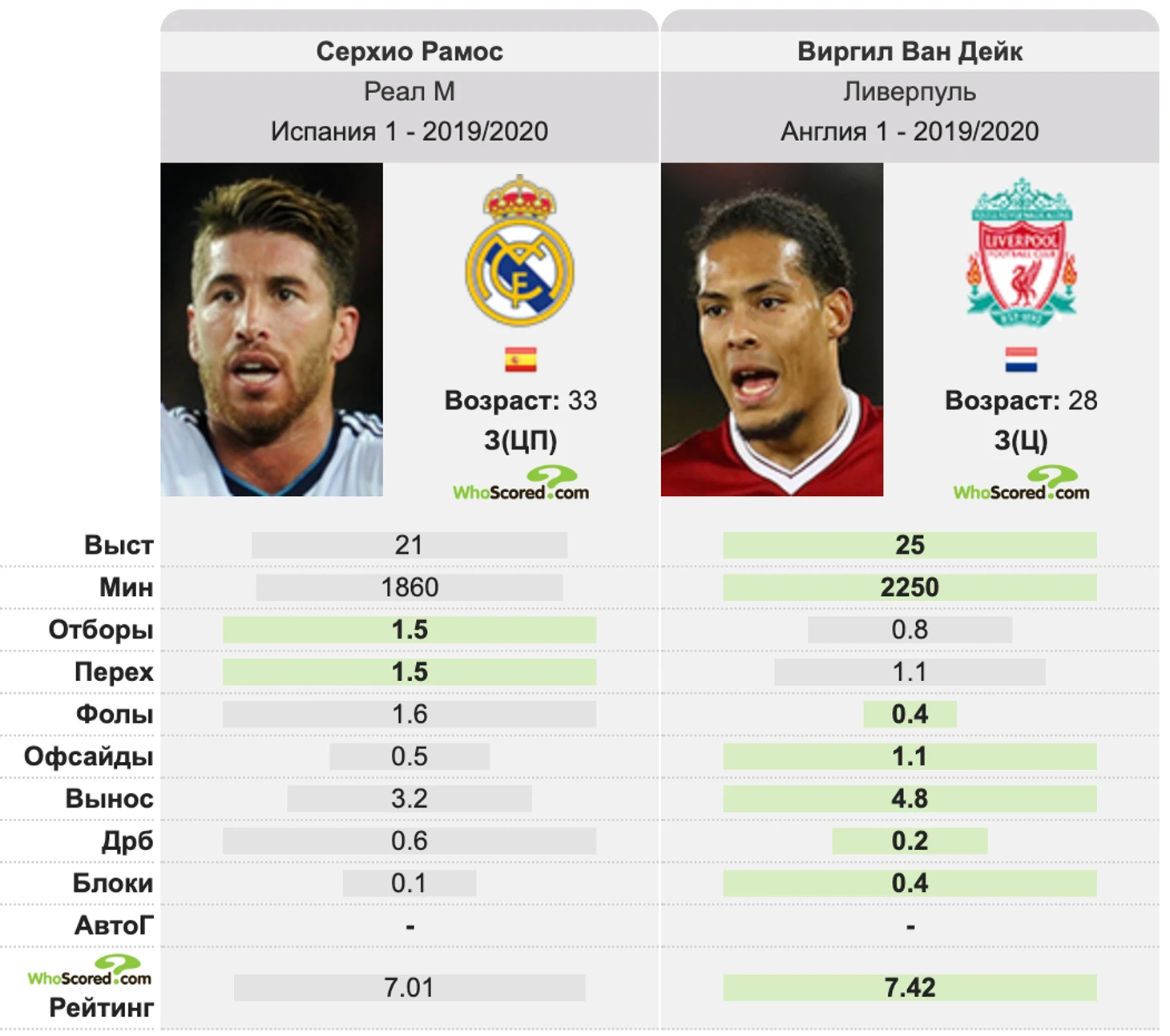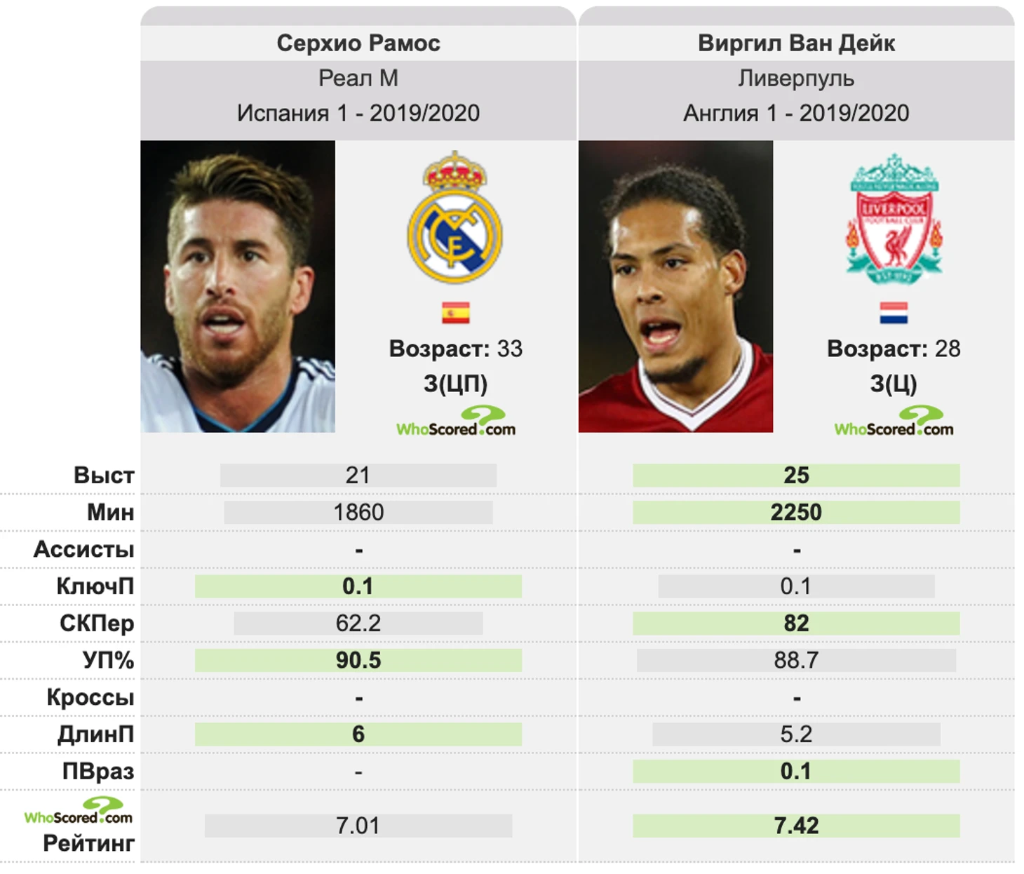 Ради чистого любопытства можно сравнить статистические показатели 33-летнего капитана мадридского "Реала" с прошлогодним претендентом на Золотой Мяч, 28-летним защитником "Ливерпуля" Вирджилом ван Дайком.