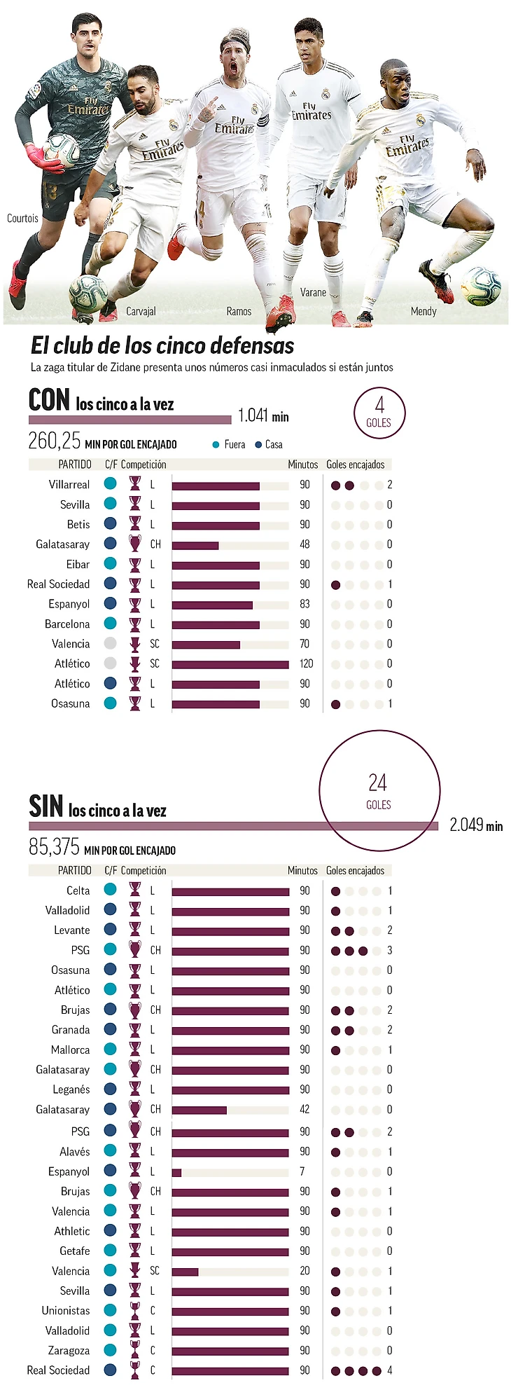 5 игроков составляют ядро новой обороны "Лос Бланкос". Тибо Куртуа, Дани Карвахаль, Рафаэль Варан, Серхио Рамос и Ферлан Менди - неоспоримые игроки стартового состава для французского специалиста. Когда они вместе на газоне, "Реал" умудрился пропустить всего 4 гола за 1041 минуту. Это означает по 1 голу почти в 3 игры. Только "Вильярреалу", "Реал Сосьедаду" и "Осасуне" удалось пробить Куртуа, когда вышеперечисленные защитники находились на поле.