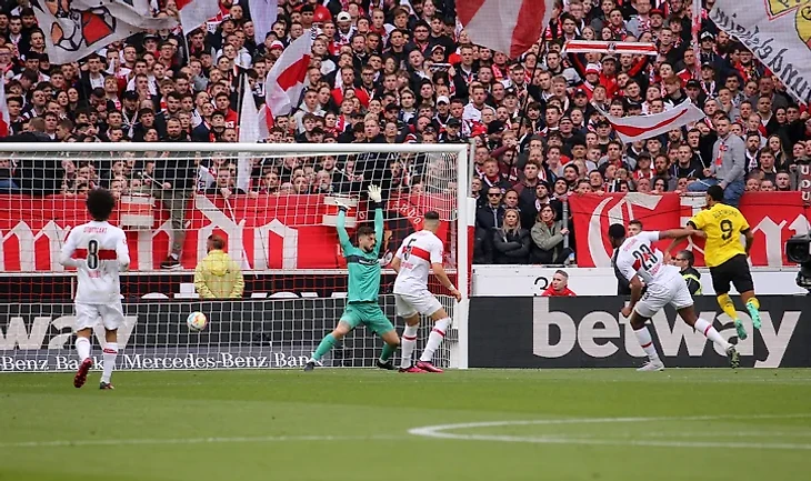 Получив эту новость. футболисты «Боруссии» активизировали свои усилия в атаке и смогли дважды отличиться в течении короткого промежутка времени.Сначала Дониэлл Мален накрутил на правом фланге Вальдемара Антона и прострелил во вратарскую, где Себастьен Алле на опережении неотразимо пробил под перекладину. А следом нидерландский вингер всё сделал сам. Получив мяч на линии штрафной, он прошёл трёх оппонентов и точным ударом в нижний угол увеличил преимущество «шмелей». До перерыва у «швабов» успел отличиться в негативном плане Константинос Мавропанос, получивший две жёлтые карточки за 4 минуты.