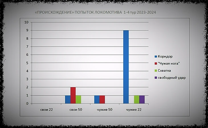Все четыре атаки, начатые в зоне 22х соперника оказались неудачными. Коридор не срабатывал, молл буксовал, розыгрыши разваливались. 3 из 4 владений завершились отбором мяча соперником. Стремление Локомотива играть надежно, поближе к чужой зачетке обернулись потерями высокого риска.