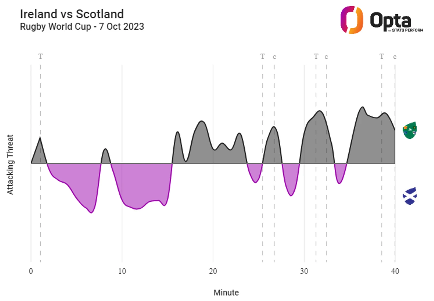 Атака Ирландии была столь же эффективной, как и их защита: они сделали пять прорывов линии, четыре из которых завершились попытками, и набирали в среднем 4,0 очка за вход в «22» Шотландии, ограничив шотландцев всего 1,8 из восьми ответных проникновений в свои «22».