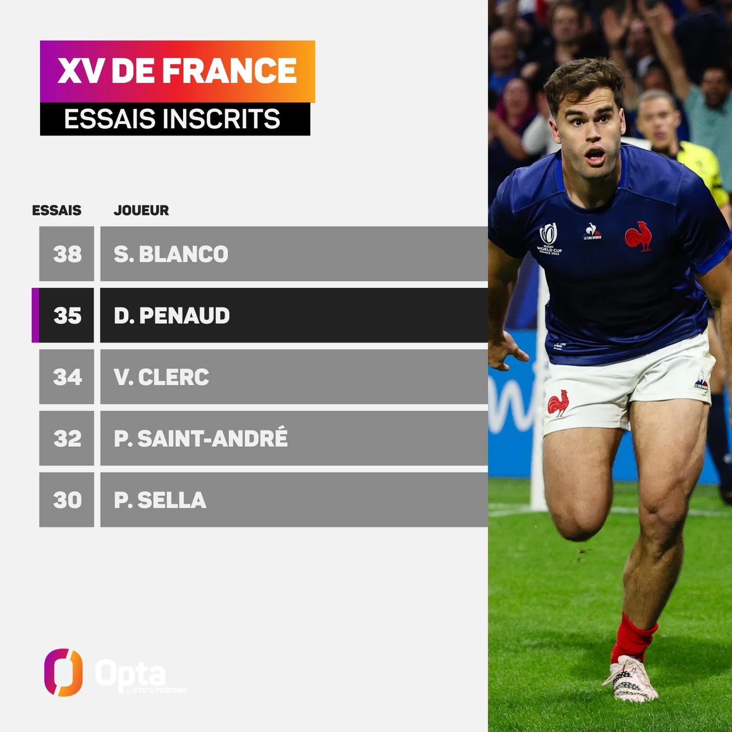 Благодаря потоку попыток Франции в этом году их число достигло 27, что является максимальным показателем на групповом этапе Кубка мира. Между тем, Дамиан Пено занес дважды и стал вторым по результативности бомбардиром Франции (35, после Сержа Бланко - 38), а Луи Бьель-Биаре стал всего лишь вторым игроком сборной Франции, совершившим попытку в своих первых трех матчах Кубка мира (после Иманола Харинордоки в 2003 году).