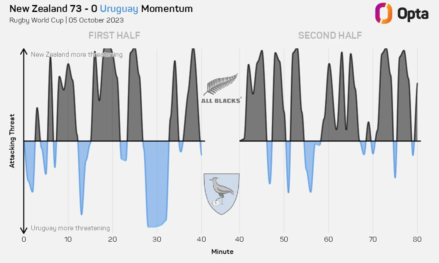 Уругвай заставил новозеландцев попотеть в первой четверти матча, и Ол Блэкам потребовалось 19 минут и 37 секунд, чтобы добыть первую попытку. В истории Кубков мира было тридцать четыре матча, в которых одна из команд набирала более 70 очков, но только в одном победителю потребовалось больше времени, чтобы занести первую попытку – Англии против Чили в турнире этого года (19 минут 51 секунда).