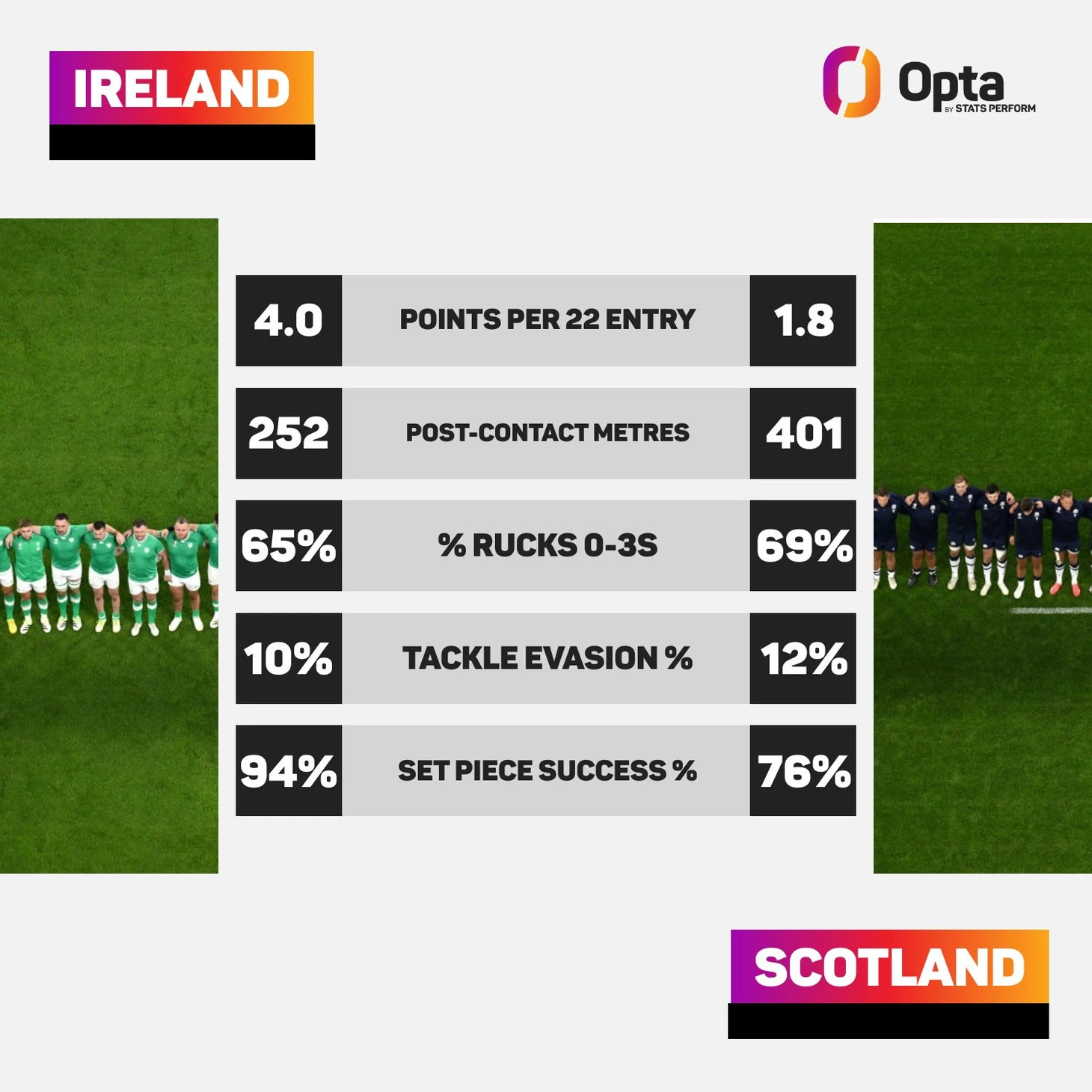 Взглянув на статистику игры, можно поверить, что это было очень упорное соперничество, которое многими и предпологалось. Всего за матч Шотландия пронесла мяч на 1366 метров - только сама Шотландия и Ирландия (обе против Румынии) пронесли больше мяча за матч на этом турнире. Но! Всего 46% этих метров Шотландии были за линией преимущества. Только Тонга (45% против ЮАР) зафиксировала более низкий показатель в матче турнира этого года. Игроки Шотландии 74 раза двигались с мячом, но не смогли достичь линии преимущества, что также было рекордом турнира. Это означало, что их показатель успеха в преодолении гейн лайн (линии преимущества) составил всего 49% по сравнению с 59% у Ирландии.