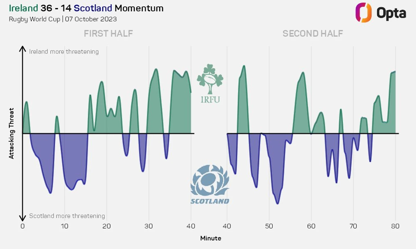 Как и в Японии четыре года назад, Ирландия разгромила Шотландию уже в первой половине важнейшего матча. В Иокогаме преимущество было в 16 очков и три попытки в первые 40 минут, но в этот раз Ирландия улучшила свой показатель, выдав один из лучших своих таймов регби на любом турнире, набрав безответных 26 очков и заработав бонусное очко.