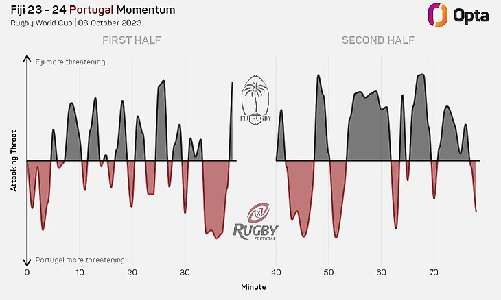 После мало результативных, но захватывающих первых 40 минут Фиджи по-прежнему оставались явными фаворитами на победу (80%).