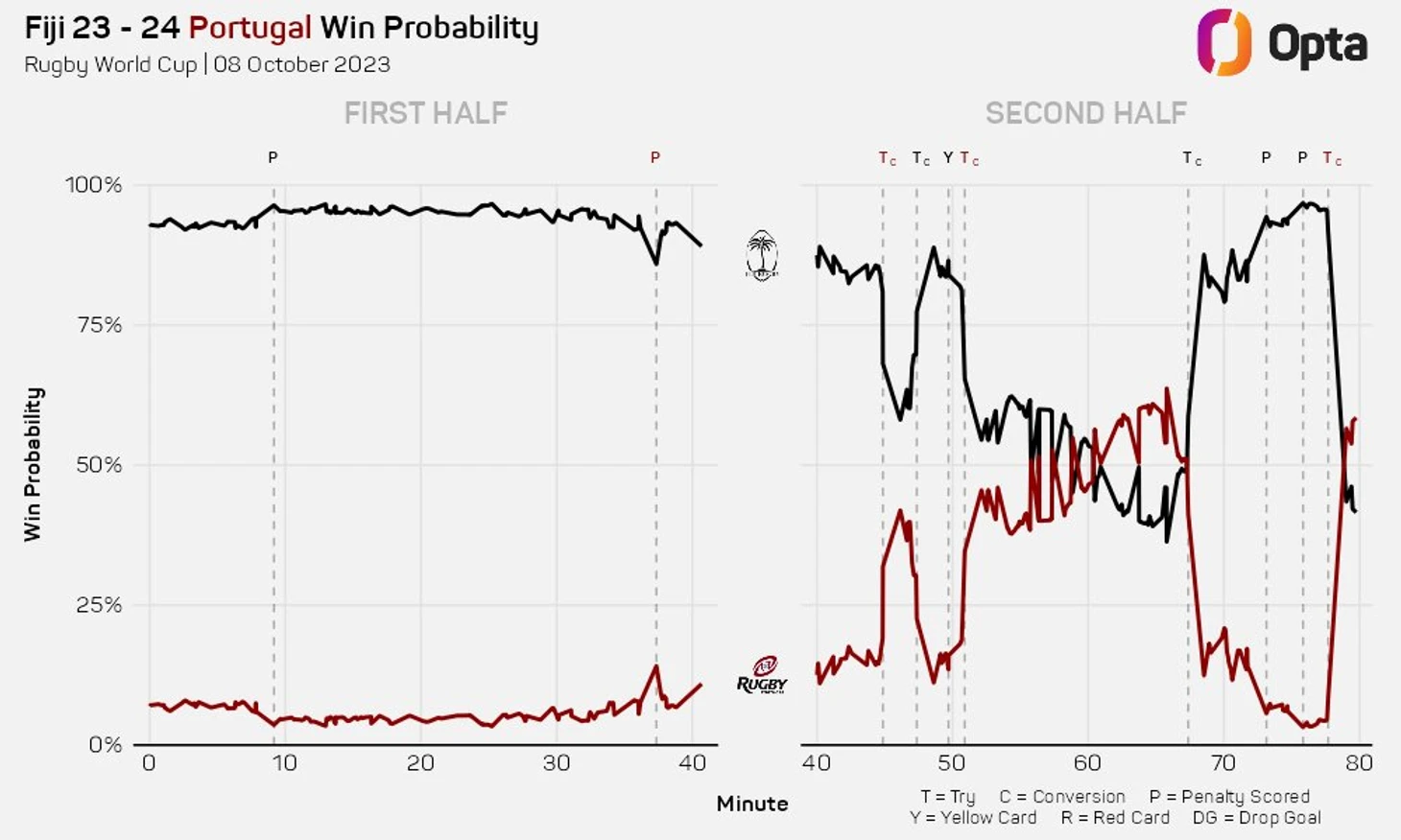 Однако вторая половина стала запредельной по накалу. Прогноз OPTA 11 раз менял выбор победителя, пока обе команды обменивались ударами. Когда Португалия, казалось, окончательно выдохлась, они совершили чудо, которое навсегда останется в португальской спортивной истории. Шансы на победу у Португалии были всего 4% на 78-й минуте, но Раффаэле Сторти проскользнул у боковой линии и отдал Родриго Марта пас на попытку.