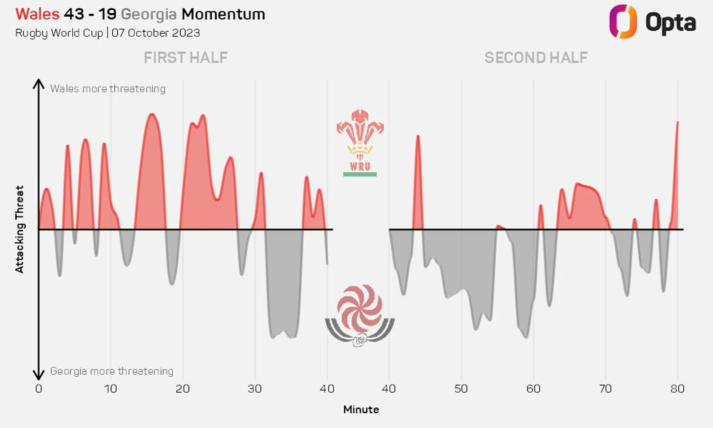 Подопечные Уоррена Гатланда были эффективны в красной зоне, набирая в среднем 4,4 очка за вход в «22», а их схватка и коридор впервые на этом турнире предоставили им идеальную платформу, и валлийцы стали лишь третьей командой, зафиксировавшей 100% результативность стандартных положений в матче этого года (также Новая Зеландия (дважды) и Аргентина).
