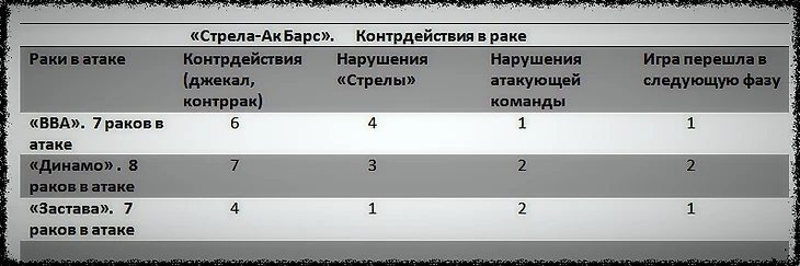 Сохранить владение против «Стрелы» тяжело. Казанцы активно бьют рак соперника, агрессивно контрдействуют в 77% случаев. В игре против «ВВА» азарт борьбы за мяч в раке достигает 86%, против «Динамо» 88%.