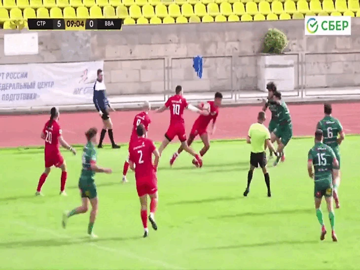 Игрок «Стрелы» Арсений Петрушинин(№22) пытается забрать мяч явно сбоку, и под вопросом, был ли освобожден игрок «ВВА» после захвата, хотя, конечно, судье виднее, он там ближе. А ведь Кулешов, который будет признан виноватым, еще даже не прибыл к месту событий.